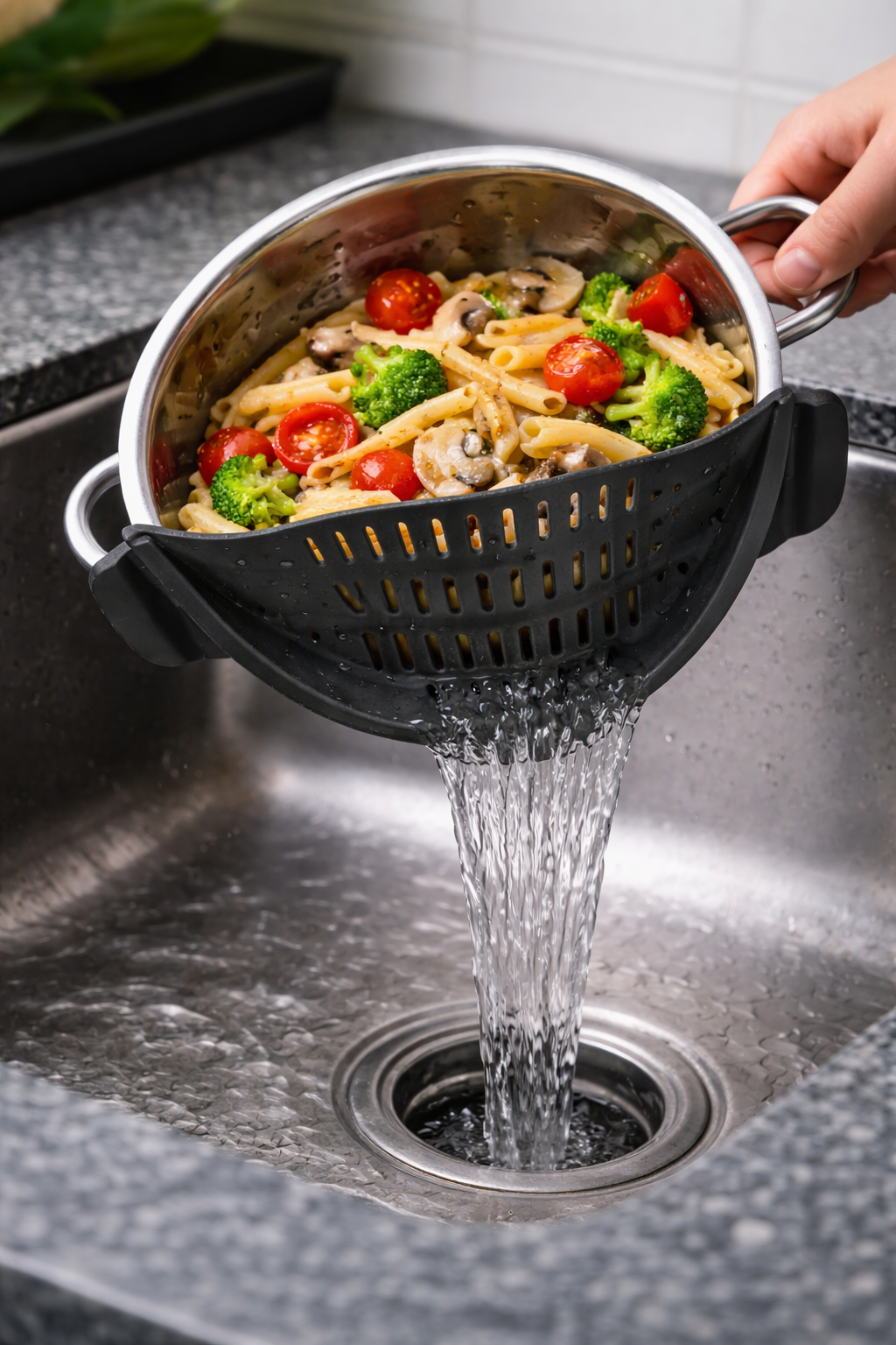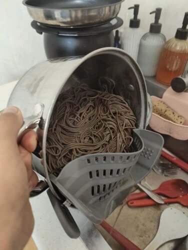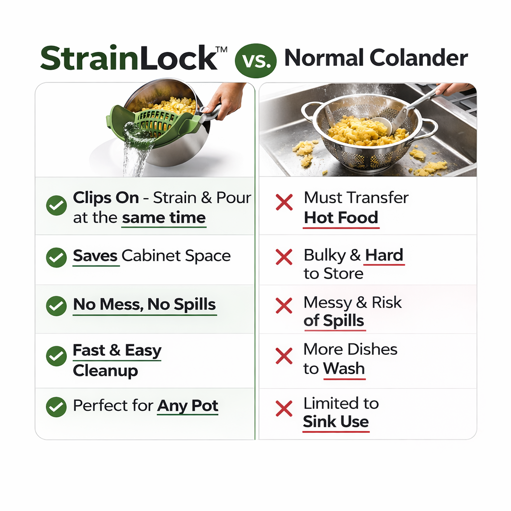 Unlike bulky colanders, the clip-on strainer saves space, reduces mess, and allows you to drain directly from the pot — no extra dish needed